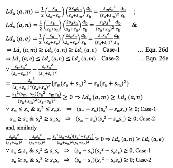 In the case, access and egress modes are same, that is, same mode mix, the limiting access distance would be same as that estimated in Eqn. 26a whether estimated based on AM or HM. Eqns. 26(d/e) suggest that the same mode mix limiting access distance of a particular mode would be maximum relative to the estimated limiting access distances of the particular mode in any alternate mix with other egress modes. So, the maximum limiting access distance of a mode is the one that is estimated considering the AM of speeds of access and egress modes. That is, a range of limiting access distances (based on HM of Speeds) exist for any particular mode ‘a’ based on ‘a-x’ mode mix.